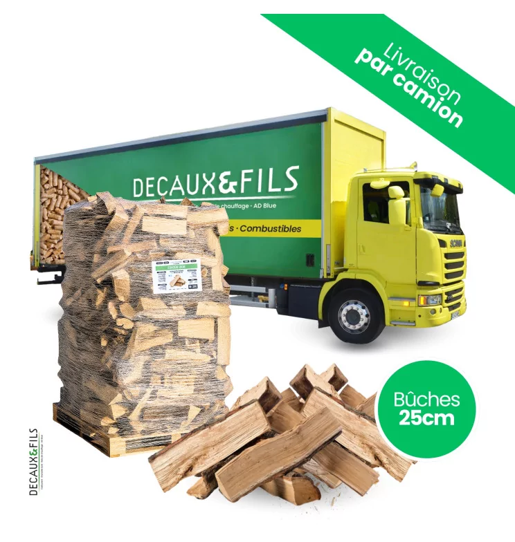 « Bois de chauffage sur palette DECAUX, bûches de 25 cm (2.2 stères) en bois 100% feuillus durs (chêne, hêtre, charme, frêne). Taux d’humidité entre 10% et 25%. Origine: 100% bois français, production Oise (60130). Retrait sur place ou livraison selon disponibilité